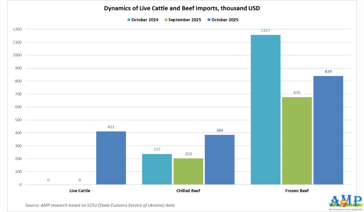 In October 2025, Ukraine imported 42 tonnes of live cattle. Ukraine did not import live cattle last month or last year. Import volumes of chilled beef increased to 14 tonnes (+27%), and frozen beef increased to 90 tonnes (+25%) compared to September 2025. Import volumes of chilled beef decreased by 13%, and frozen beef decreased by 55% compared to October 2024. From January to October 2025, Ukraine increased the import of live cattle to 554 tonnes (+18%), but reduced the import of chilled beef to 120 tonnes (-3%) and frozen beef to 1.16 thousand tonnes (-45%) compared to the same period last year.