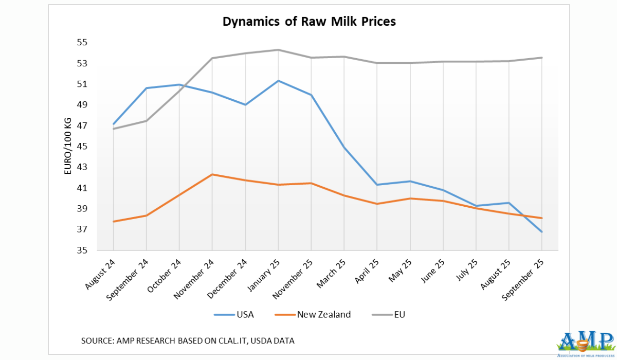 Europe. According to preliminary data from the European Commission, the average raw milk price in the EU in October 2025 was 52.91 euro cents per kg, which is only 0.94% less than in September 2025. Compared to the price as of October 2024, milk in the EU became 2.3% more expensive. According to IFCN, milk prices in the EU have remained higher than the global level since 2022. However, the increase in raw milk production is putting pressure on procurement prices, and this trend will continue. The weighted average milk price may fall below €40 per 100 kg, after which stabilization is expected.