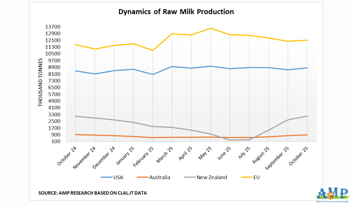 Oceania. As reported by clal.it, milk yield volumes in New Zealand in October 2025 amounted to 3.13 million tonnes, which is 17% more compared to September and 2% more compared to October 2024. In January–October 2025, milk yield volumes in New Zealand amounted to 16.26 million tonnes, which is 1.6% more than last year. According to IFCN, New Zealand's share in global milk production is 2–3%, but its share in global dairy product trade is one-third. Since only 5 million people live in the country, the domestic market is too small to absorb all locally produced milk. Therefore, surplus milk is exported in the form of commodity goods.