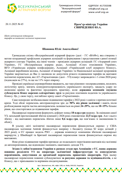 Асоціація виробників молока разом з профільними асоціаціями, які входять до Всеукраїнського аграрного форуму (ВАФ), звернулися до Прем’єр-міністра Юлії Свириденко з вимогою невідкладно зупинити заплановане підвищення тарифів на вантажні залізничні перевезення, яке «Укрзалізниця» планує запровадити з 1 січня 2026 року — індексацію на 27%, а через півроку — ще на 11%.