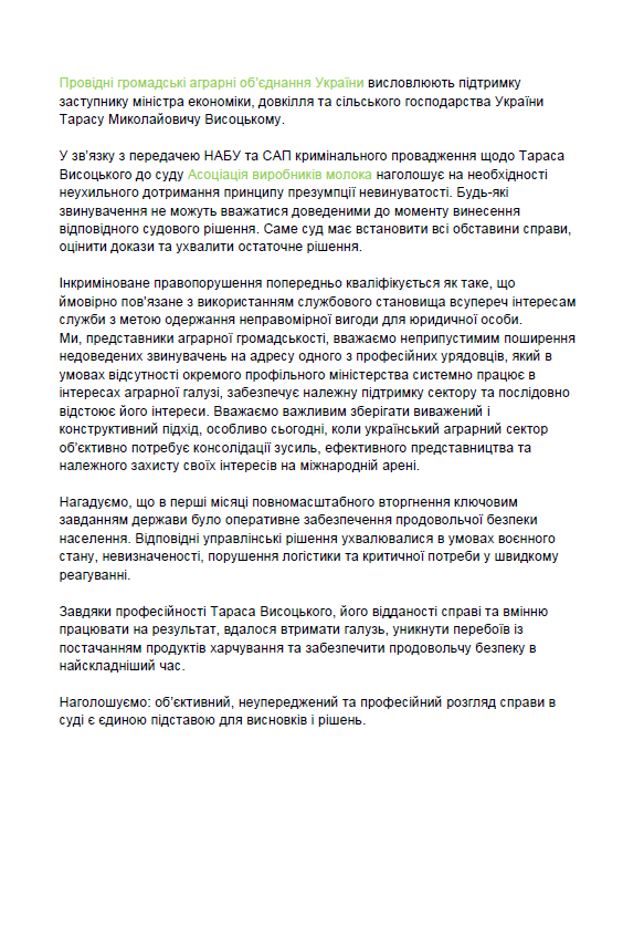 Водночас АВМ вважає неприпустимим поширення недоведених звинувачень щодо одного з ключових управлінців аграрного сектору, який в умовах відсутності окремого профільного міністерства системно працює в інтересах галузі, забезпечує її стабільність та належну підтримку.