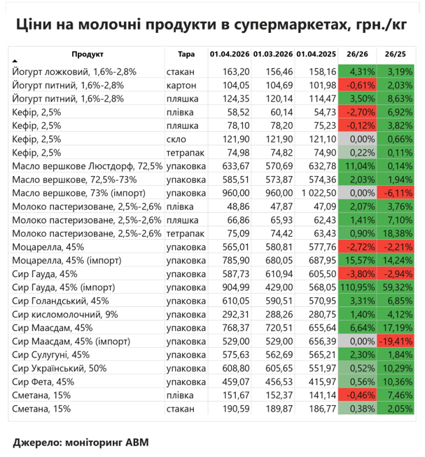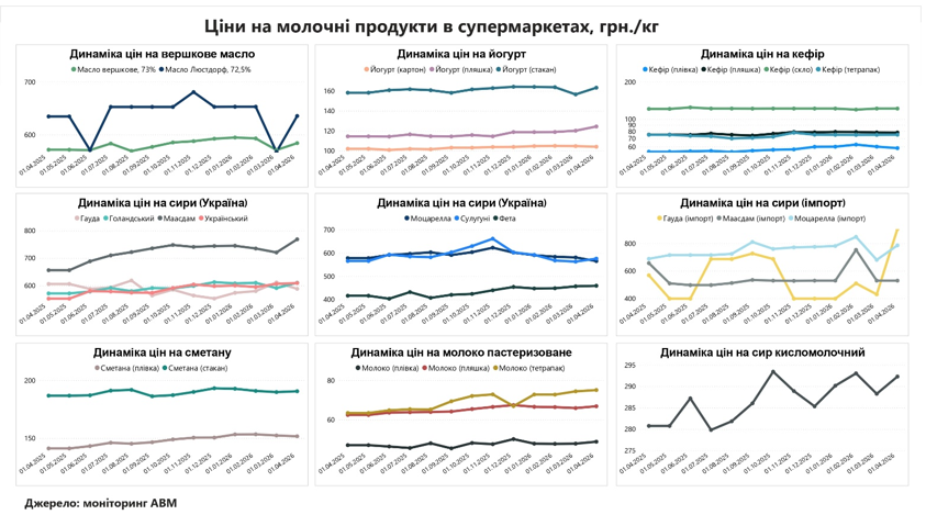 В Україні спостерігається переважно зростання цін на молочні продукти у річному вимірі. Відносно попереднього місяця здешевіли лише сметана в плівці, кефір в плівці та пластиковій пляшці, йогурт питний у картонній упаковці, сири Гауда та Моцарела, а ціни на інші молочні продукти виросли. До кінця березня очікувалося підвищення цін на молочні продукти в Україні через збільшення витрат на логістику внаслідок підвищення цін на паливо та збільшення обсягів експорту. Попри слабку активність на молочному ринку в зимовий період через кризу надвиробництва молока у світі, в подальшому ймовірне зростання супутніх витрат та подорожчання молочних продуктів. Внаслідок війни в регіоні Перської затоки виникли перебої з поставками нафти по Ормузькій протоці, що вплинуло на стрибок цін на нафтопродукти та збільшення вартості фрахту. Скорочення поставок молочних продуктів з Ірану вплинуло на підвищення інтересу до української молочної продукції з боку покупців з Центральної Азії та Південного Кавказу.