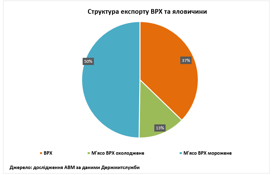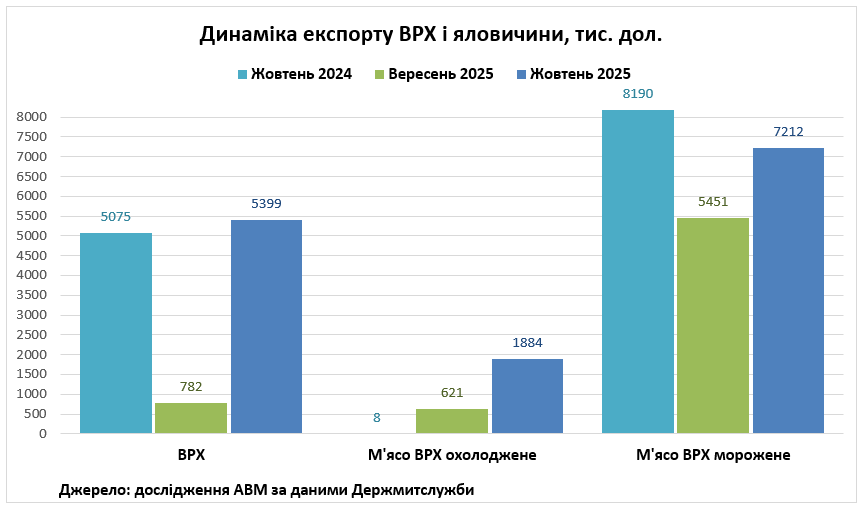 За попередніми даними Держмитслужби, у жовтні 2025 року Україна експортувала близько 1,65 тис. т ВРХ живою вагою, що на 197% більше відносно вересня 2025 року, але на 31% менше відносно жовтня 2024 року. Грошова виручка за експортованих тварин становила 5,39 млн. дол., що майже в 7 разів більше відносно вересня 2025 року і на 6% більше відносно жовтня 2024 року. У січні-жовтні 2025 року Україна експортувала 14,94 тис. т ВРХ живою вагою (+16%) на суму 34,61 млн. дол. (+42%). Протягом 10 місяців 2025 року ключовими напрямками експорту ВРХ для українських компаній були Ліван (84%), Казахстан (9%) та Лівія (6,4%).
