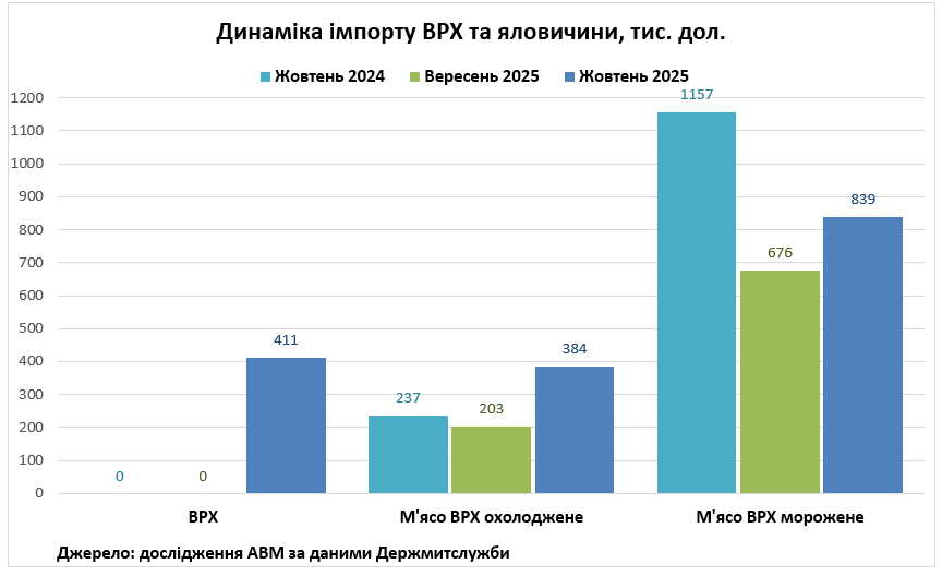 У жовтні 2025 року Україна імпортувала 42 т ВРХ. Минулого місяця і минулого року Україна не імпортувала ВРХ. Обсяги імпорту охолодженої яловичини збільшилися до 14 т (+27%), а мороженої яловичини збільшилися до 90 т (+25%) відносно вересня 2025 року. Обсяги імпорту охолодженої яловичини скоротилися на 13%, а мороженої яловичини скоротилися на 55% відносно жовтня 2024 року. В січні-жовтні 2025 року Україна збільшила імпорт ВРХ живою вагою до 554 т (+18%), але скоротила імпорт охолодженої яловичини до 120 т (-3%) та мороженої яловичини до 1,16 тис. т (-45%) відносно минулорічного періоду.
