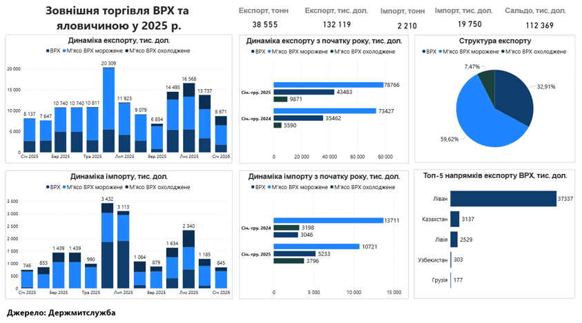 За попередніми даними Держмитслужби, у січні 2026 року Україна експортувала близько 958 т ВРХ живою вагою, що на 36% менше відносно грудня 2025 року і на 33% менше відносно січня 2025 року. Грошова виручка за експортованих тварин становила 1,82 млн. дол., що на 46% менше відносно грудня 2025 року і на 33% менше відносно січня 2025 року.