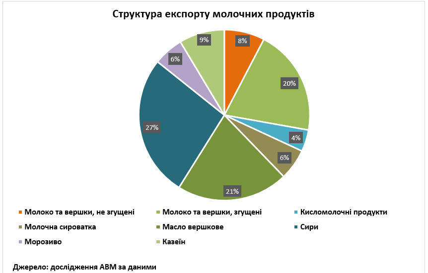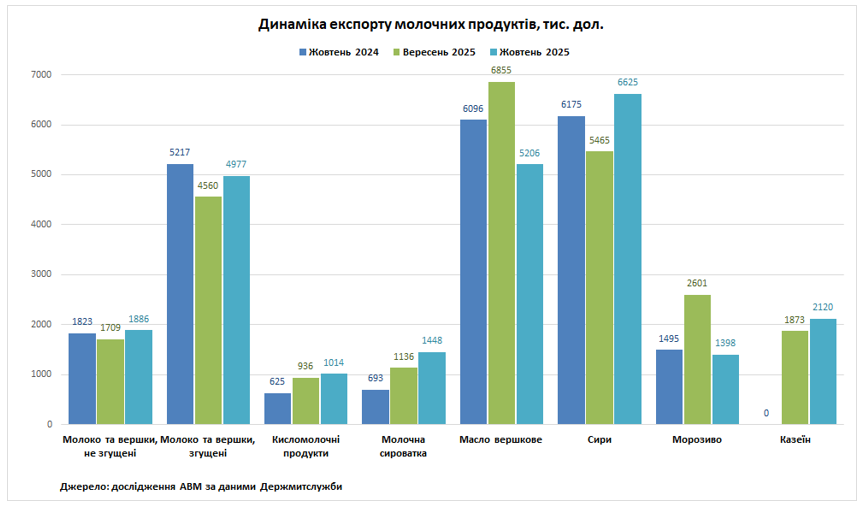 У жовтні 2025 року Україна скоротила натуральні обсяги експорту вершкового масла до 714 т (-22%) та морозива до 348 т (-49,6%) відносно вересня 2025 року. Найбільше виросли обсяги поставок на зовнішні ринки молочної сироватки до 1,31 тис. т (+25%) та сиру до 1,41 тис. т (+16%) відносно попереднього місяця. Порівняно з жовтнем 2024 року виросли поставки на зовнішні ринки кисломолочних продуктів (+37%) та молочної сироватки (+62%), але скоротилися поставки масла вершкового (-11%), морозива (-16%), молока та вершків, не згущених (-13%), молока та вершків, згущених (-5%).