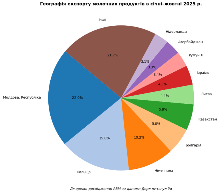 Щодо географії експорту, то в січні-жовтні 2025 року найбільші обсяги молока та вершків, не згущених (92%), кисломолочних продуктів (84%), масла вершкового (29%) та сиру (34%) були відвантажені в Молдову, молока та вершків, згущених (19,5%), молочної сироватки (34%) та казеїну (49%) в Польщу, а морозива (29%) в Німеччину.