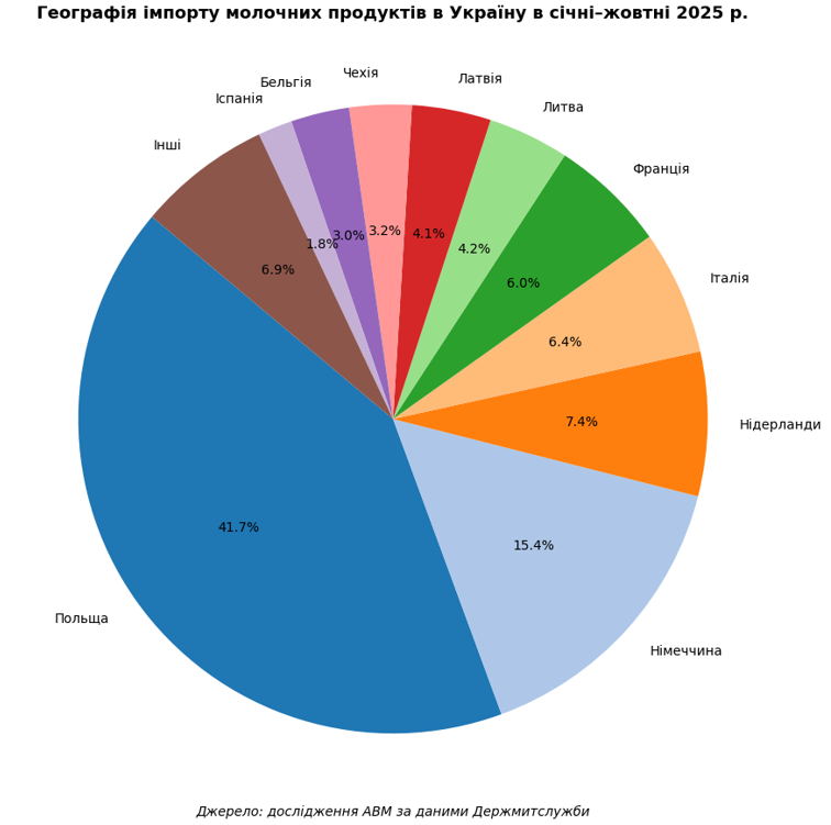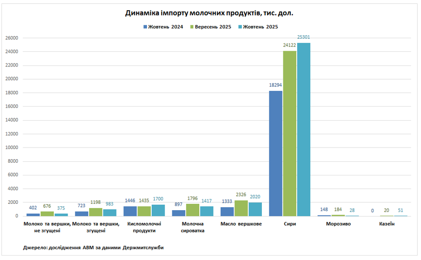 У жовтні 2025 року Україна імпортувала 5,89 тис. т молочних продуктів на суму 31,87 млн дол. Відносно вересня 2025 року натуральні обсяги імпорту скоротилися на 7%, а відносно жовтня 2024 року збільшилися на 20%. В січні-жовтні 2025 року Україна імпортувала 52,61 тис. т (+12%) молочних продуктів на суму 269,73 млн. дол. (+21%). Найбільша частка від загальних натуральних обсягів імпорту в вересні 2025 року припадає на сири (64%). Найбільшим постачальником сирів в Україну в січні-жовтні була Польща з часткою в 44%. З Польщі завозилася в Україну більшість інших молочних продуктів за виключенням вершкового масла та казеїну, де перші позиції займає Німеччина з частками 24,5% та 73% відповідно.
