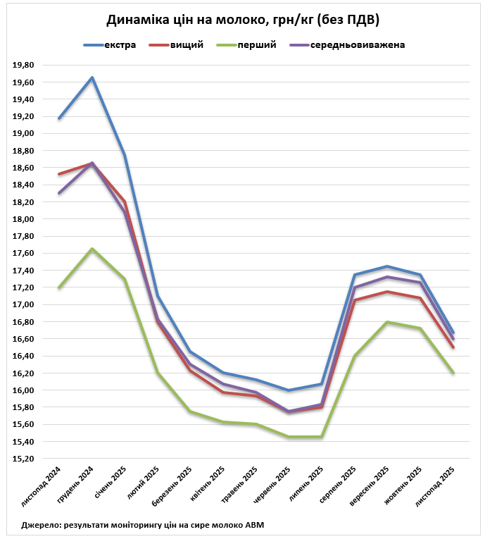 Середня закупівельна ціна молока екстра ґатунку станом на 25 листопада становила 16,30 грн/кг без ПДВ, що на 95 коп. менше відносно попереднього місяця. Діапазон цін на цей ґатунок в господарствах варіюється від 16,00 до 16,80 грн/кг без ПДВ.