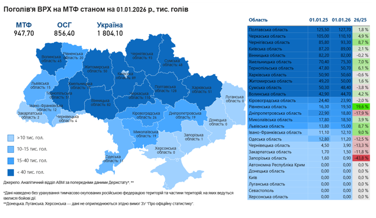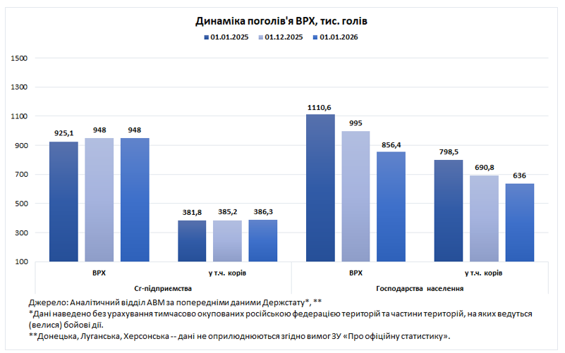 За попередніми даними Держстату, станом на 1 січня 2026 року в присадибному і промисловому секторі України утримується 1 млн 804,1 тис. голів ВРХ, у тому числі 1 млн 22,3 тис. корів. Порівняно до 1 грудня 2025 року, поголів’я ВРХ в Україні скоротилося на 138,9 тис. голів (-7%), а чисельність корів скоротилася на 53,7 тис. голів (-5%). Порівняно до 1 січня 2025 року поголів’я ВРХ скоротилося на 232 тис. голів (-11%), у тому числі корів – на 158 тис. голів (-13%).