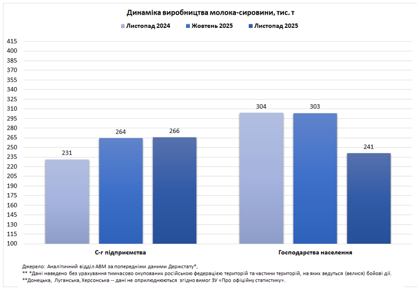 За попередніми даними Держстату, у листопаді 2025 року господарства усіх категорій виробили 507 тис. т молока-сировини, що на 61 тис. т менше (-11%) відносно жовтня поточного року і на 28 тис. т менше (-5%) відносно листопада 2024 року. В січні-листопаді 2025 року обсяги надою в Україні становили 6,38 млн т, що на 299 тис. т менше (-4%) відносно минулорічного періоду. У листопаді 2025 року частка підприємств у виробництві молока-сировини становила 52%, а господарств населення – 48%.