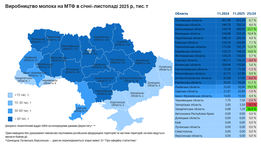В січні-листопаді 2025 року обсяги виробництва молока-сировини наростили сільгосппідприємства у Закарпатській області (+36%), Хмельницькій області (+23%), Львівській області (+20%), Харківській області (+15%), Рівненській області (+12%), Тернопільській області (+12%), Вінницькій області (+10%), Миколаївській області (+10%), Київській області (+7%), Полтавській області (+7%), Волинській області (+6%), Житомирській області (+6%), Черкаській області (+5%), Чернігівській області (+5%) та Івано-Франківській області (+4%), відносно минулорічного періоду. Взагалі, обсяги надою збільшили МТФ в 15 областях.