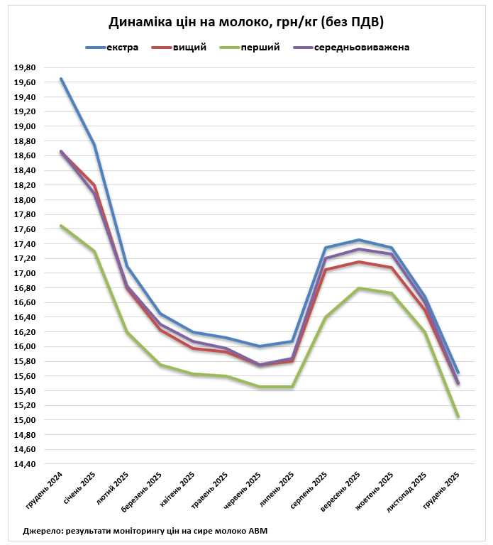 Середня закупівельна ціна молока екстра ґатунку станом на 20 грудня становила 15,30 грн/кг без ПДВ, що на 1,00 грн. менше відносно попереднього місяця. Діапазон цін на цей ґатунок в господарствах варіюється від 14,80 до 16,00 грн/кг без ПДВ. Нижня межа цінового діапазону знизилась на 1,20 грн., а верхня межа знизилась на 80 коп.