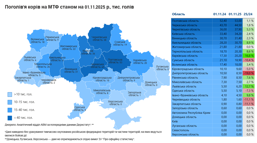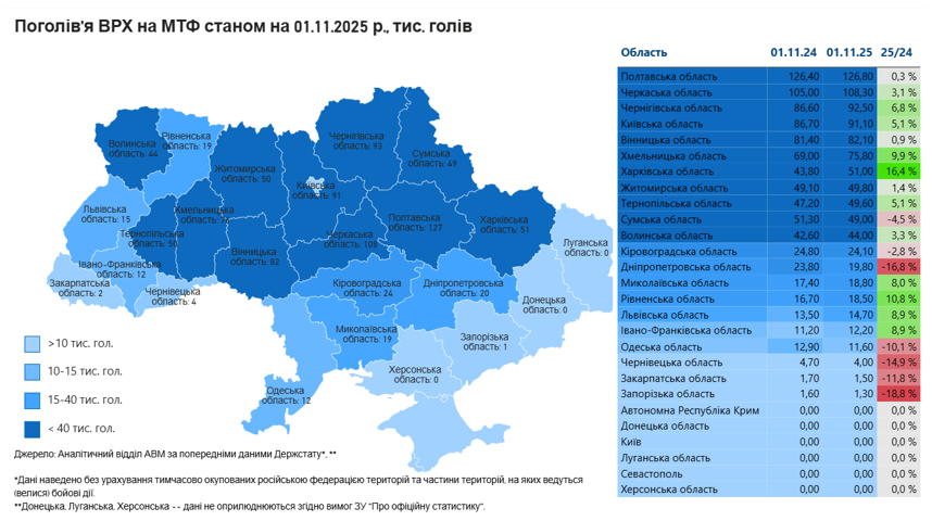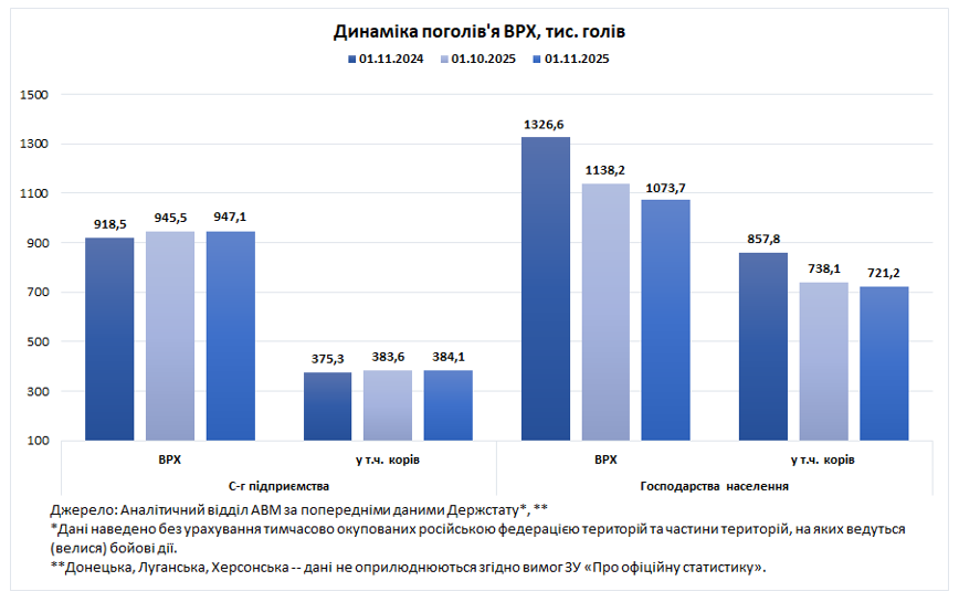 За попередніми даними Держстату, станом на 1 листопада 2025 року в присадибному і промисловому секторі України утримується 2 млн. 20,8 тис. голів ВРХ, у тому числі 1 млн. 105,3 тис. корів. Порівняно до 1 жовтня 2025 року, поголів’я ВРХ в Україні скоротилося на 62,9 тис. голів (-3%), а чисельність корів скоротилася на 16,4 тис. голів (-1%). Порівняно до 1 листопада 2024 року поголів’я ВРХ скоротилося на 224 тис. голів (-10%), у тому числі корів – на 128 тис. голів (-10%). Близько 47% тварин утримується на промислових підприємствах, а 53% – в господарствах населення.