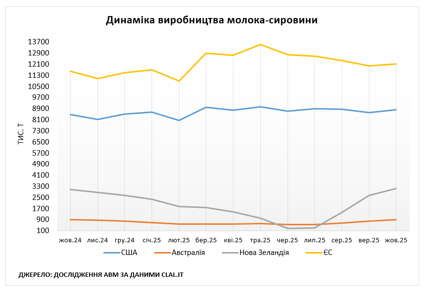 Європа. За даними clal.it, у жовтні 2025 року обсяги надою в ЄС становили 12,13 млн т, що на 1% більше відносно вересня і на 5% більше відносно жовтня 2024 року. В січні-жовтні 2025 року обсяги виробництва молока-сировини в ЄС становили 124,14 млн т, що лише на 0,8% більше відносно минулорічного періоду. За даними IFCN, з 2022 року темпи зростання виробництва молока у Європі були відносно низькими, але з серпня 2025 року відбулося суттєве пожвавлення надоїв. Відтак, ріст виробництва молока становив понад 5% у річному обчисленні і такого не спостерігалося на ринку з 2015 року. Фермери збільшили надої на тлі порівняно високих цін на молоко-сировину та низьких цін на корми. На європейському ринку збільшився вміст жиру та білка в молоці на 1-1,5% цього року.