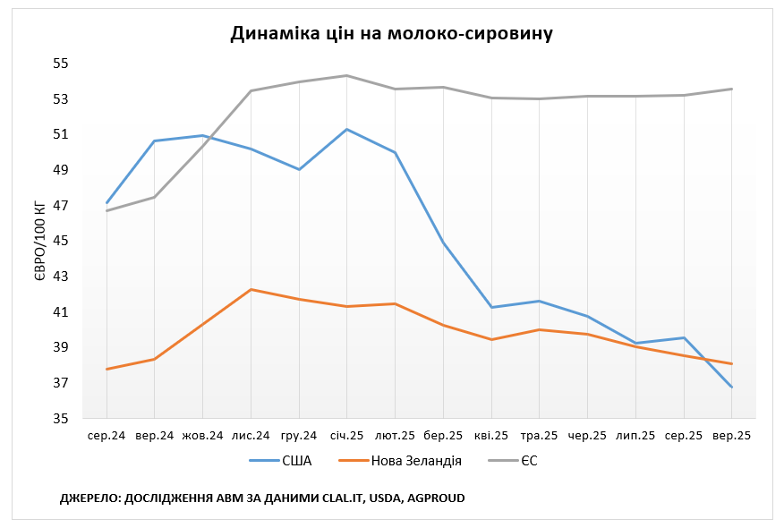 Європа. За попередніми даними Єврокомісії, у жовтні 2025 року середня ціна на молоко-сировину в ЄС становила 52,91 євроцентів за кг, що лише на 0,94% менше ніж у вересні 2025 року. Відносно ціни станом на жовтень 2024 року, молоко в ЄС подорожчало на 2,3%. За даними IFCN, ціни на молоко в ЄС з 2022 року залишаються вищими за світовий рівень. Однак, збільшення виробництва молока-сировини тисне на закупівельні ціни і дана тенденція триватиме. Середньовиважена ціна на молоко може опуститися нижче 40 євро за 100 кг, після чого очікується стабілізація.