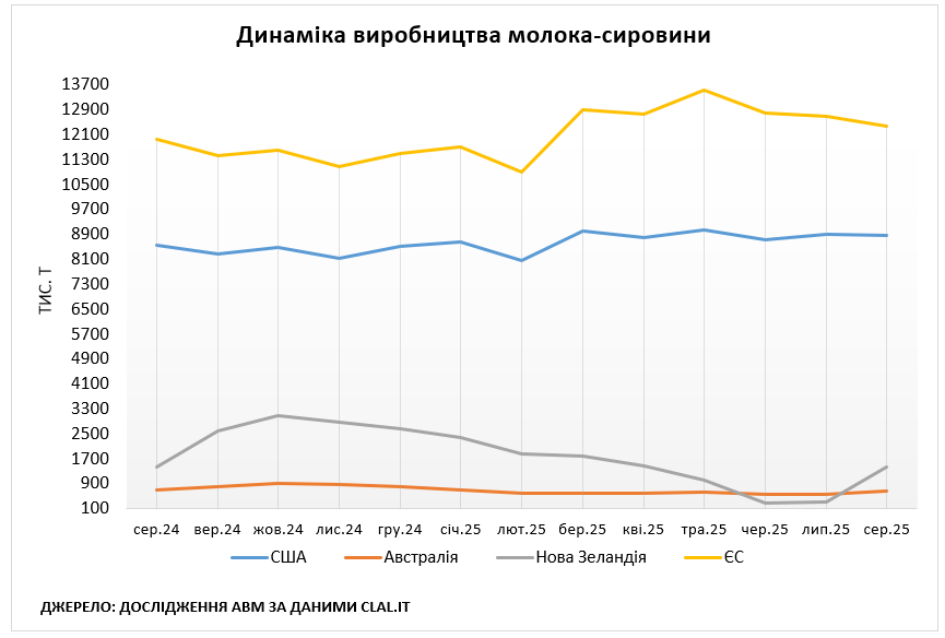 На скорочення обсягів молочного експорту ЄС вплинули вищі ціни на сухе незбиране молоко європейського виробництва, яке дорожче ніж пропозиція постачальників з інших регіонів. На збільшення пропозиції масла в Європі також вплинуло збільшення імпорту. Нові торговельні домовленості ЄС та США передбачають, що європейці мають щороку купувати в США без мит до 20 тис. т молочних продуктів, зокрема вершкового масла. Надлишки нереалізованих біржових товарів стримують ріст закупівельних цін на молоко-сировину та фермери змушені скорочувати поголів’я та виробництво заради стабілізації цінової ситуації в умовах зростання виробничих витрат та жорсткіших вимог ЄС щодо добрив та комфорту корів. Зокрема, за даними clal.it, в серпні 2025 року ЄС скоротив обсяги виробництва молока до 12,38 млн. т, що на 2,4% менше відносно липня (+3,6% до серпня 2024 року). За 8 місяців 2025 року обсяги надою в ЄС становили 99,96 млн. т, що майже дорівнює показникам минулорічного періоду (-0,1%).