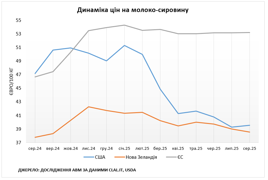 Європа. За даними Єврокомісії, у серпні 2025 року середня ціна на молоко-сировину в ЄС становила 53,23 євро за 100 кг, що на 0,8% більше ніж у липні 2025 року. Вірогідно, суттєвого зростання закупівельних цін в ЄС не відбулося під впливом зниження світових цін на вершкове масло та збільшення пропозиції біржових товарів внаслідок скорочення експорту. В перспективі ріст цін на молоко-сировину в Європі може стримувати збільшення імпорту дешевого американського масла.