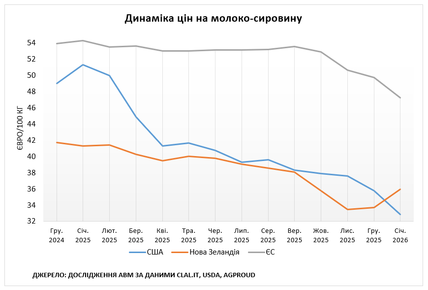 США. За даними clal.it, у січні 2026 року ціна на молоко-сировину у США становила 32,87 євро за 100 кг, що на 8,13% менше відносно грудня 2025-го і на 35,95% менше відносно січня 2025 року. На зниження закупівельних цін вплинуло зростання надоїв та пропозиції біржових товарів.