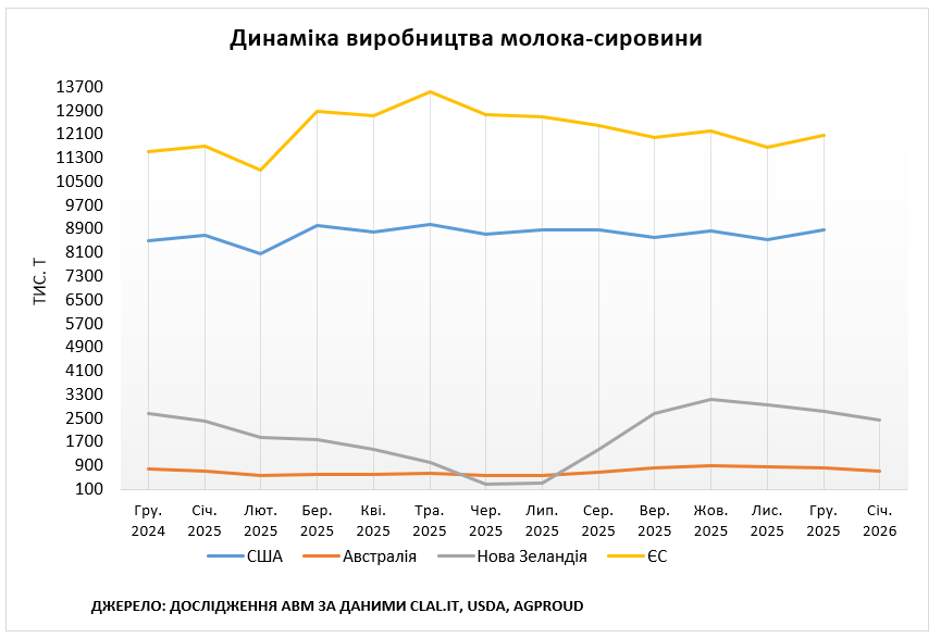 За даними clal.it, у січні 2026 року обсяги виробництва молока-сировини в Австралії становили 719 тис. т, що на 12% менше відносно грудня 2025-го, але на 2% більше відносно січня 2025 року. В Австралії погодні умови в ключових молочних регіонах погіршилися. Спостерігалися нижчі за середні рівні опадів, сильна спека та лісові пожежі у штаті Вікторія, що призвело до скорочення запасів води в усіх контрольованих резервуарах порівняно з минулим роком. Ціни на воду досягли найвищого рівня за понад п’ять років.