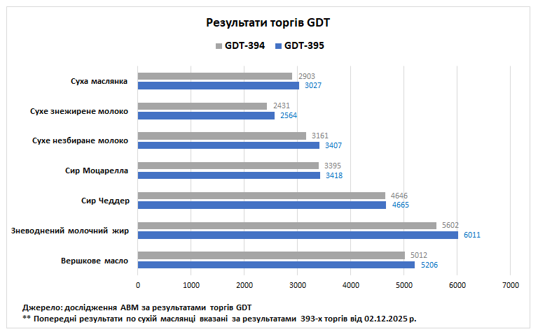 За результатами торгів, ціна на зневоднений молочний жир становила 6011 дол. за т, що на 7,4% більше відносно попередніх торгів. За даними USDA, в грудні активність на ринку була стриманою, а профіцит сировини вплинув на зниження цін, що зробило їх привабливими для покупців. Згідно прогнозу GDT, в лютому зневоднений молочний жир може подорожчати на 7,2%.