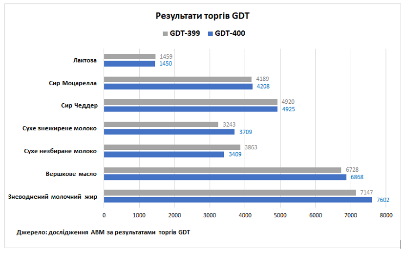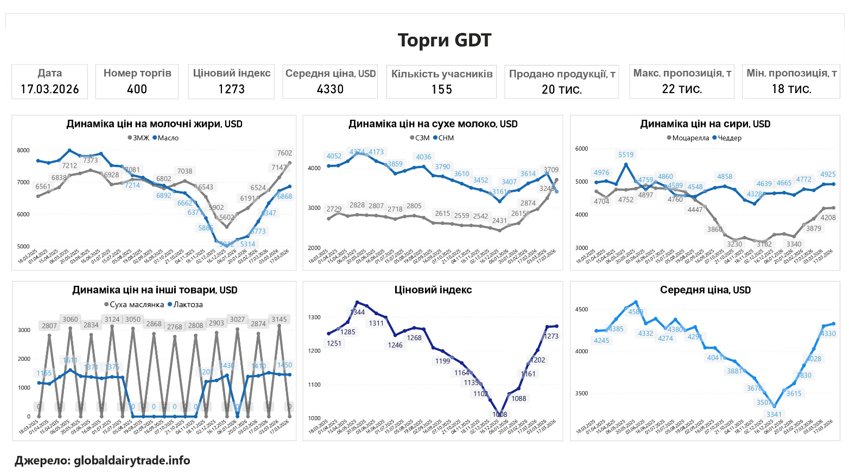 У вівторок, 17 березня, відбулися 400-ті торги GDT, за результатами яких ціновий індекс становив 1273, що лише на 2 пункти (+0,1%) більше відносно попередніх торгів. Середня ціна на молочні продукти становила 4330 дол. за т, що на 29 дол. більше відносно результатів попереднього аукціону. Під час торгів було продано 19500 т біржових товарів, що на 639 т більше відносно результатів минулого аукціону. Мінімальна пропозиція була зафіксована на рівні 17844 т, а максимальна – на рівні 21831 т. В торгах взяли участь 155 операторів молочного ринку, що на 10 компанії менше відносно 3 березня.