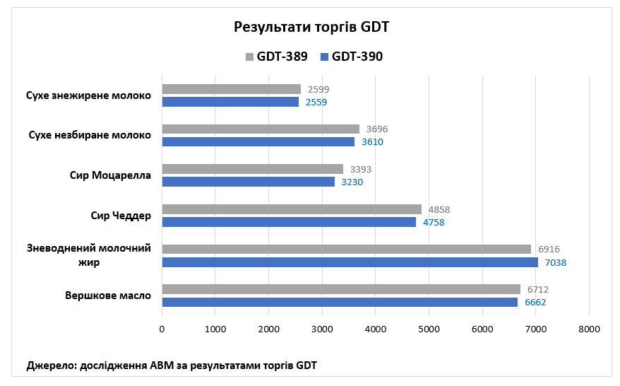 За результатами торгів, ціна на зневоднений молочний жир становила 7038 дол. за т, що на 122 дол. більше відносно попередніх торгів. Як повідомляє USDA, у Європі попит на молочний жир стабільний, а ціни на товар укріпилися в нижньому діапазоні.