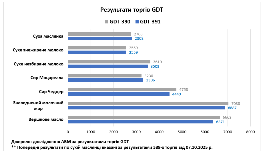 У вівторок, 4 листопада, відбулися 391-ші торги GDT, за результатами яких ціновий індекс становив 1135, що на 2,4% менше відносно попередніх торгів. Середня ціна на молочні продукти становила 3768 дол. за т, що на 113 дол. менше відносно результатів попереднього аукціону. Під час торгів було продано 40621 т біржових товарів, що на 1113 т менше відносно результатів минулого аукціону. Мінімальна пропозиція була зафіксована на рівні 35875 т, а максимальна – на рівні 43190 т. В торгах взяли участь 146 операторів молочного ринку, що на 19 компанії менше відносно 21 жовтня.