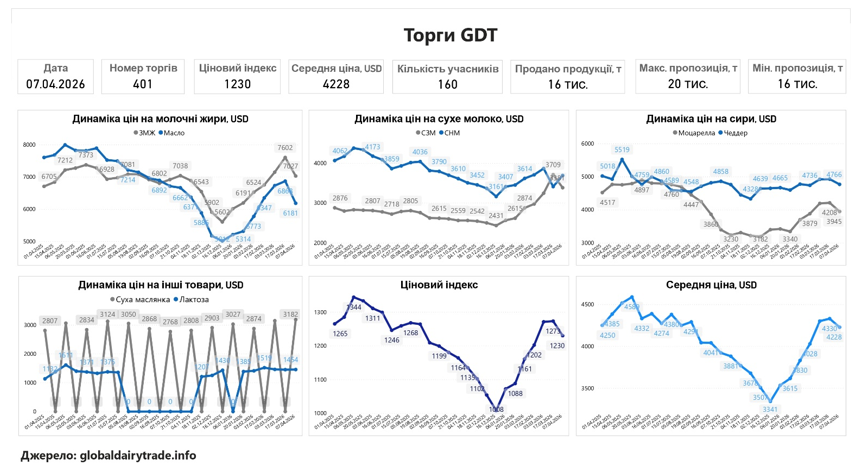 У вівторок, 7 квітня, відбулися 401-ші торги GDT, за результатами яких ціновий індекс становив 1230, що лише на 43 пункти (-3,4%) менше відносно попередніх торгів. Середня ціна на молочні продукти становила 4228 дол. за т, що на 102 дол. менше відносно результатів попереднього аукціону. Під час торгів було продано 16497 т біржових товарів, що на 3003 т менше відносно результатів минулого аукціону. Мінімальна пропозиція була зафіксована на рівні 15546 т, а максимальна – на рівні 20172 т. В торгах взяли участь 160 операторів молочного ринку, що на 5 компанії більше відносно 17 березня.