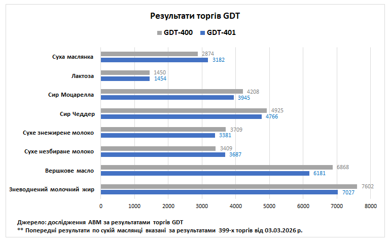 За результатами торгів, ціна на зневоднений молочний жир становила 7027 дол. за т, що на 7,1% менше відносно попередніх торгів. За даними CZ Insights, в умовах війни США та Ізраїлю проти Ірану існує невизначеність попиту на товар в регіоні Близького Сходу, де він зосереджений. Існують ризики пов’язані з порушенням звичних логістичних маршрутів. Ціни на жири залишаються під тиском, але можуть різко збільшитися у разі перебоїв з постачанням. Згідно прогнозу GDT, у травні ціна на зневоднений молочний жир може знизитись на 9,8%, а у червні впасти на 8,6%.