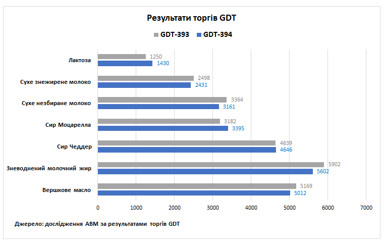 У вівторок, 16 грудня, відбулися 394-ті торги GDT, за результатами яких ціновий індекс становив 1008, що на 46 пунктів (-4,4%) менше відносно попередніх торгів. Середня ціна на молочні продукти становила 3341 дол. за т, що на 166 дол. менше відносно результатів попереднього аукціону. Під час торгів було продано 33974 т біржових товарів, що на 308 т менше відносно результатів минулого аукціону. Мінімальна пропозиція була зафіксована на рівні 33938 т, а максимальна – на рівні 40896 т. В торгах взяли участь 156 операторів молочного ринку, що на 10 компаній менше відносно 2 грудня.