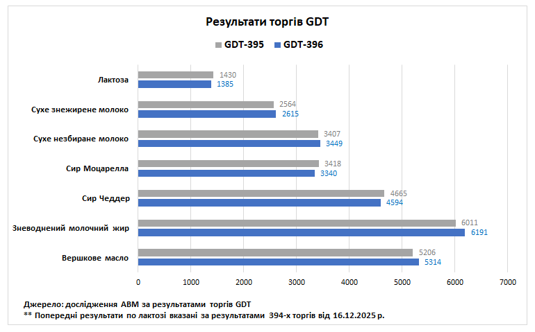 За результатами торгів, ціна на зневоднений молочний жир становила 6191 дол. за т, що на 3% більше відносно попередніх торгів. За даними USDA, минулого тижня ціни на молочний жир знизилися в Європі на тлій високої пропозиції вершків. Втім, ф’ючерси на зневоднений молочний жир виросли в Океанії, де минув сезонний пік виробництва молока-сировини і надої пішли на спад. Згідно прогнозу GDT, в лютому зневоднений молочний жир може подорожчати на 7,7%, а в березні на 2,5%.