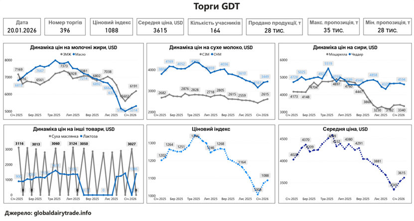 У вівторок, 20 січня, відбулися 396-ті торги GDT, за результатами яких ціновий індекс становив 1088, що на 16 пунктів (+1,5%) більше відносно попередніх торгів. Середня ціна на молочні продукти становила 3615 дол. за т, що на 82 дол. більше відносно результатів попереднього аукціону. Під час торгів було продано 27821 т біржових товарів, що на 1461 т менше відносно результатів минулого аукціону. Мінімальна пропозиція була зафіксована на рівні 27999 т, а максимальна – на рівні 35056 т. В торгах взяли участь 164 операторів молочного ринку, що на 13 компаній менше відносно 6 січня.