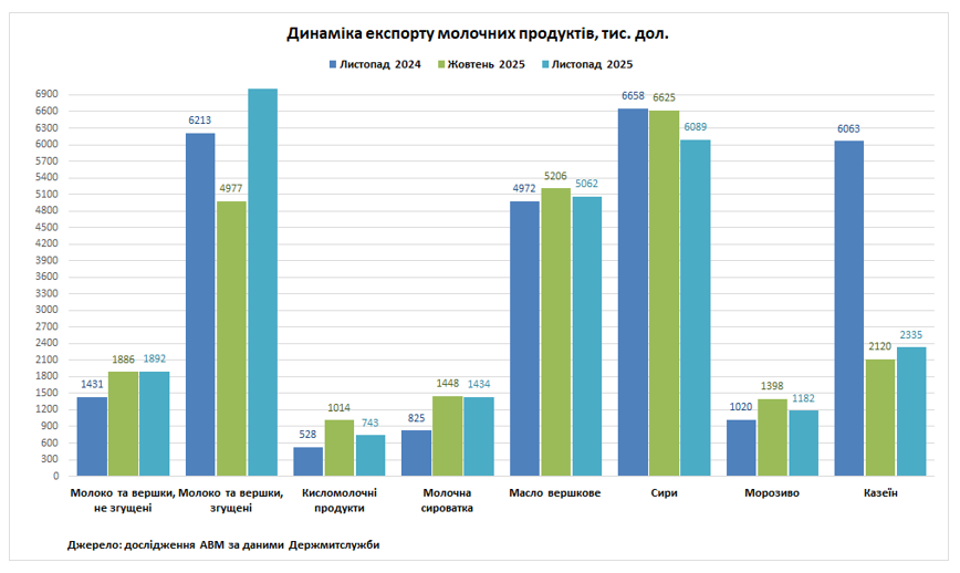 У листопаді 2025 року Україна суттєво збільшила натуральні обсяги експорту молока та вершків, згущених до 3,63 тис. т (+82%), а також підвищилися відвантаження вершкового масла до 743 т (+4%), казеїну до 356 т (+6%) та молока та вершків, не згущених (+3%). Скоротилися обсяги поставок кисломолочних продуктів до 506 т (-17%), сирів до 1,27 тис. т (-10%), морозива до 316 т (-9%) та молочної сироватки до 1,29 тис. т (-2%) відносно жовтня 2025 року. Порівняно з листопадом 2024 року Україна найбільше наростила експорт молока та вершків, згущених (+54%), молочної сироватки (+51%), кисломолочних продуктів (+35%), а також збільшила обсяги відвантажень молока та вершків, не згущених (+20%), вершкового масла (+16%) та морозива (+6) на зовнішні ринки. Водночас, скоротилися натуральні обсяги експорту сирів (-11%) та казеїну (-63%) відносно листопаду минулого року.