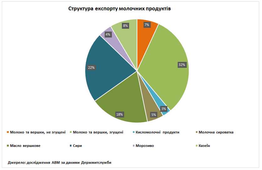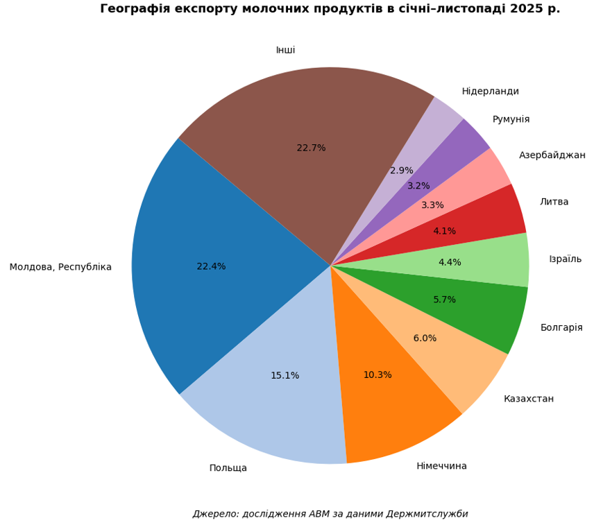 Щодо географії експорту, то в січні-листопаді 2025 року найбільші обсяги молока та вершків, не згущених (91%), кисломолочних продуктів (84%), масла вершкового (30%) та сиру (34%) були відвантажені в Молдову, молока та вершків, згущених (18%), молочної сироватки (35%) та казеїну (47%) в Польщу, а морозива (29%) у Німеччину.