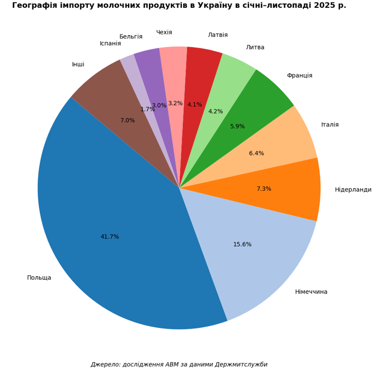 У листопаді 2025 року Україна імпортувала 5,55 тис. т молочних продуктів на суму 30,91 млн дол. Відносно жовтня 2025 року натуральні обсяги імпорту скоротилися на 6%, а відносно листопада 2024 року скоротилися на 6%. В січні-листопаді 2025 року Україна імпортувала 58,16 тис. т (+10%) молочних продуктів на суму 300,65 млн. дол. (+20%). Найбільша частка від загальних натуральних обсягів імпорту в вересні 2025 року припадає на сири (64%). Найбільшим постачальником сирів в Україну в січні-листопаді була Польща з часткою в 64%. З Польщі завозилася в Україну більшість інших молочних продуктів за виключенням вершкового масла та казеїну, де перші позиції займає Німеччина.
