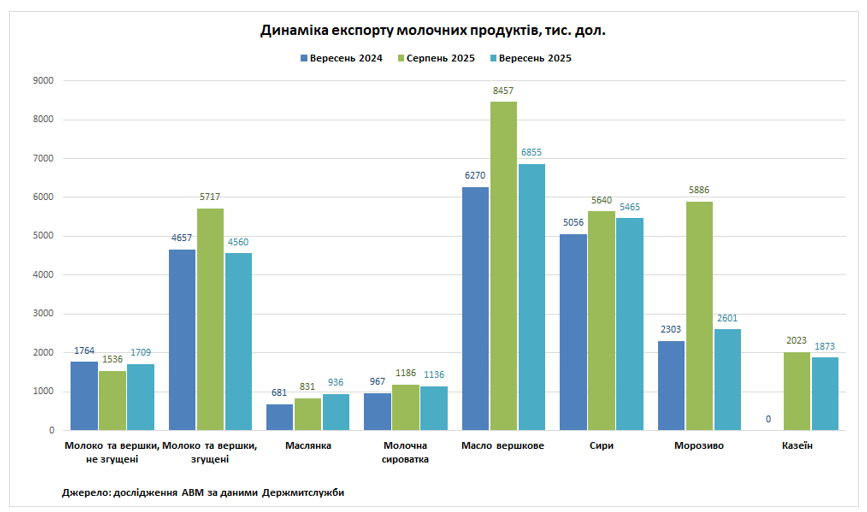 У вересні 2025 року Україна наростила лише натуральні обсяги експорту молока та вершків, не згущених до 2,07 тис. т (+12%) відносно серпня. По іншим позиціям спостерігалося скорочення обсягів експорту. Найбільше скоротилися обсяги поставок морозива до 1,58 тис. т (-56,3%), молока та вершків згущених до 1,81 тис. т (-20%) та масла вершкового до 916 т (-19%) відносно серпня 2025 року. Порівняно з вереснем 2024 року виросли поставки на зовнішні ринки маслянки (+31%), масла вершкового (+4%), сирів (+2%) та морозива (+2%).