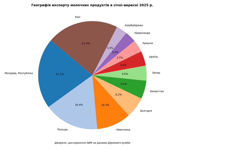Щодо географії експорту, то в січні-вересні 2025 року найбільші обсяги молока та вершків, не згущених (91%), маслянки (85,4%), масла вершкового (26,7%) та сиру (34,5%) були відвантажені в Молдову, молока та вершків, згущених (20,8%), молочної сироватки (33,6%) та казеїну (48,9%) в Польщу, а морозива (28,7%) в Німеччину.
