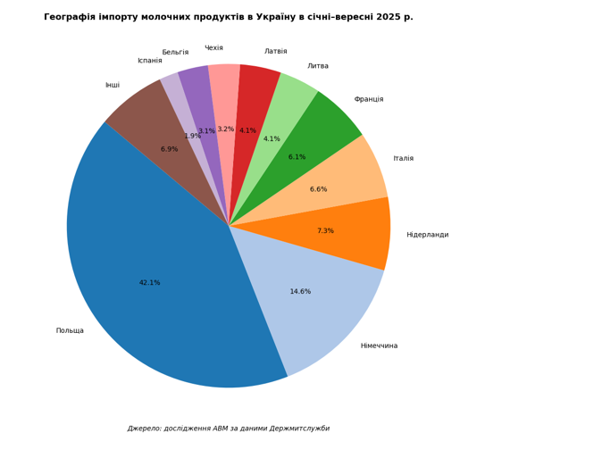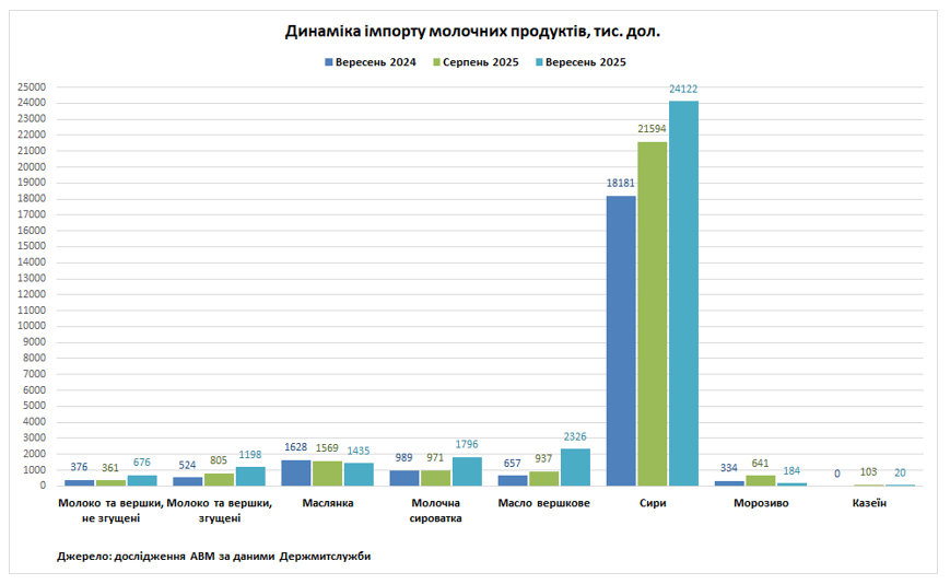 У вересні 2025 року Україна імпортувала 6,3 тис. т молочних продуктів на суму 31,75 млн дол. Відносно серпня 2025 року натуральні обсяги імпорту збільшилися на 21%, а відносно вересня 2024 року збільшилися на 24,7%. В січні-вересні 2025 року Україна імпортувала 46,71 тис. т (+12%) молочних продуктів на суму 237,86 млн. дол. (+19%). Найбільша частка від загальних натуральних обсягів імпорту в вересні 2025 року припадає на сири (57%). Найбільшим постачальником сирів в Україну в січні-вересні була Польща з часткою в 44,12%. З Польщі завозилася в Україну більшість інших молочних продуктів за виключенням масла вершкового та казеїну, де перші позиції займає Німеччина з частками 22,34% та 76,33% відповідно.