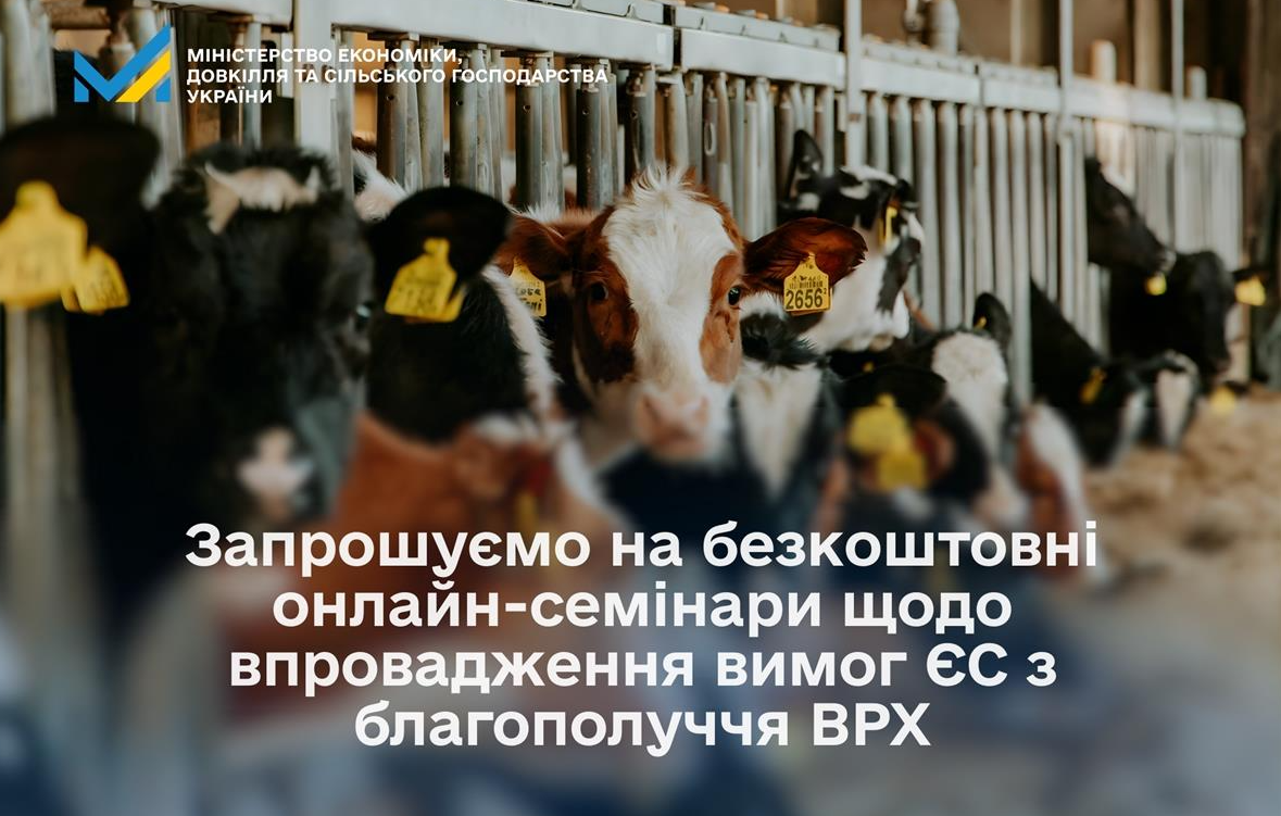 Запрошуємо взяти участь у вебінарі від ДПСС щодо роз'яснення вимог до благополуччя ВРХ і телят, що вступають в дію з 01 січня 2026. Звертаємо увагу, що для малих фермерських господарств вебінар запланований на понеділок 22 грудня 2025 року, а для промислових господарств - 23 грудня 2025 року, вівторок.