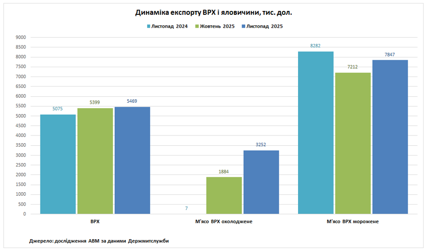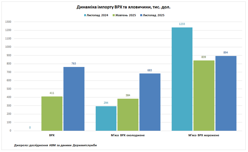 У листопаді 2025 року Україна імпортувала 91 т ВРХ, що на 117% більше відносно жовтня. Обсяги імпорту охолодженої яловичини збільшилися до 56 т (+300%), а мороженої яловичини збільшилися до 100 т (+11%) відносно жовтня 2025 року. Обсяги імпорту охолодженої яловичини збільшилися на 334%, а мороженої яловичини скоротилися на 55% відносно листопада 2024 року. В січні-листопаді 2025 року Україна збільшила імпорт ВРХ живою вагою до 645 т (+37%), охолодженої яловичини до 176 т (+28%), але скоротила імпорт мороженої яловичини до 1,26 тис. т (-46%) відносно минулорічного періоду.