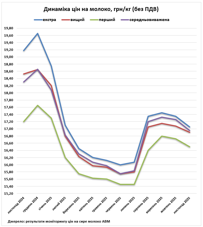 Середня закупівельна ціна молока екстра ґатунку станом на 10 листопада склала 17,05 грн/кг без ПДВ, що на 20 коп. менше відносно попереднього місяця. Діапазон цін на цей ґатунок в господарствах варіюється від 16,50 до 17,50 грн/кг без ПДВ. Нижній діапазон цін знизився на 50 коп., а верхній – на 70 коп.