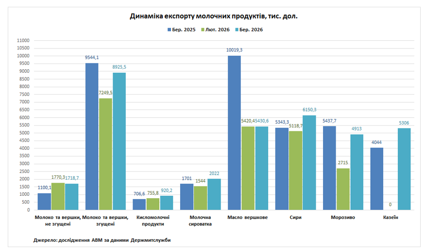 У березні 2026 року Україна збільшила експортну виручку за відвантажені партії до молока та вершків, згущених до 8,92 млн дол. (+23%), кисломолочних продуктів до 920 тис. дол. (+22%), молочної сироватки до 2,02 млн дол. (+31%), вершкового масла до 5,43 млн дол. (+0,2%), сирів до 6,15 млн дол. (+20%) та морозива до 5,3 млн дол. (+81%), але скоротилася грошова виручка за експортоване молоко та вершки, не згущені до 1,71 млн дол. (-3%) відносно лютого поточного року.