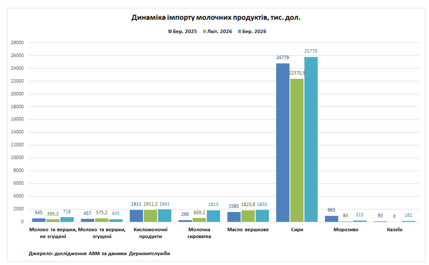У березні 2026 року Україна збільшила натуральні обсяги експорту молока та вершків, згущених до 3,6 тис. т (+20%), кисломолочних продуктів до 612 т (+22%), молочної сироватки до 1,71 тис. т (+24%), вершкового масла до 980 т (+5%), сирів до 1,32 тис. т (+14%) та морозива до 1,37 тис. т (+96%), але скоротилися обсяги поставок молока та вершків, не згущених до 2,01 тис. т (-10%) відносно лютого поточного року.