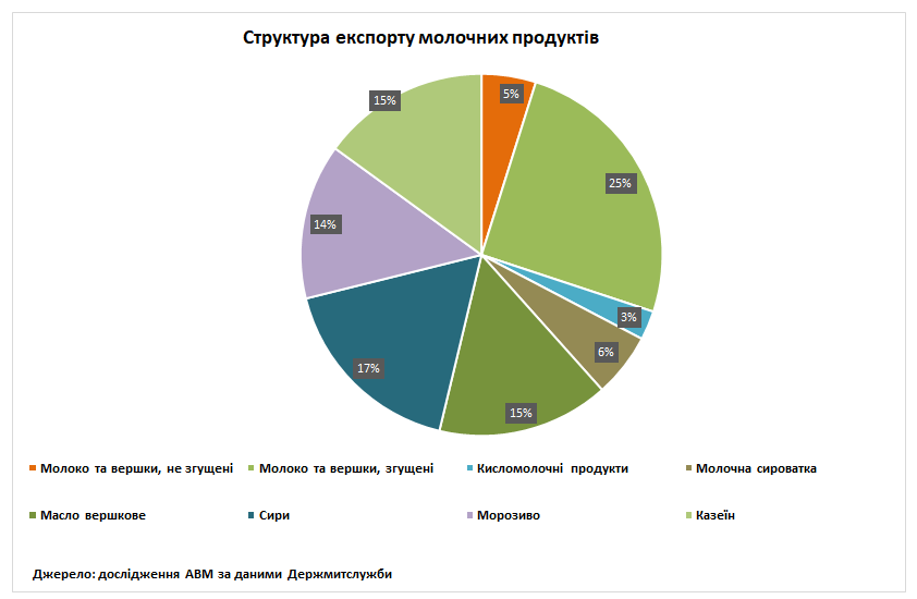 Відносно березня 2025 року Україна збільшила натуральні обсяги експорту казеїну на 30% (до 810 т) молока та вершків, не згущених на 42%, кисломолочних продуктів на 44%, сирів на 15%, але скоротила відвантаження молока та вершків, згущених на 7%, молочної сироватки на 6%, вершкового масла на 31% та морозива на 10%.
