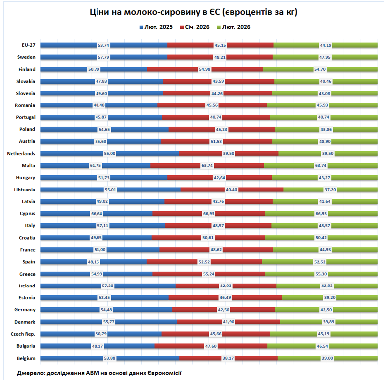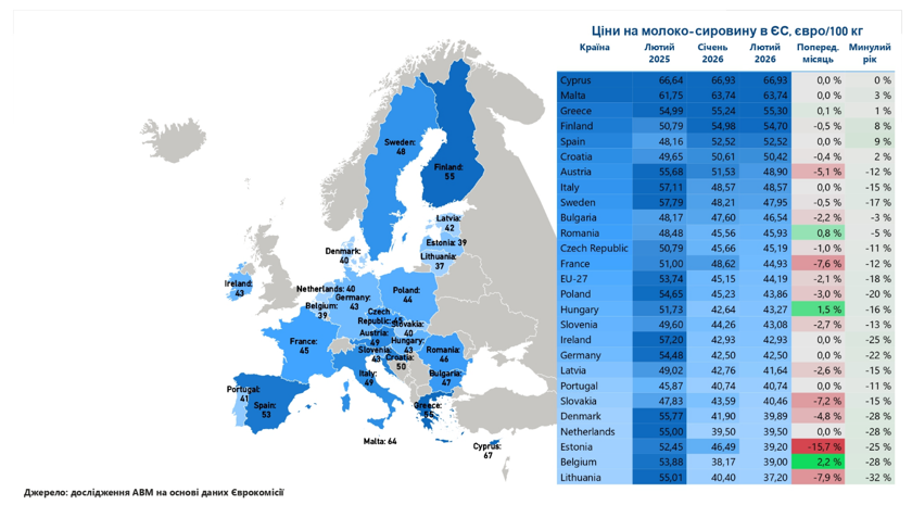 За попередніми даними Єврокомісії, у лютому 2026 року середня ціна на молоко-сировину в ЄС становила 44,19 євроцентів за кг, що на 2,13% менше ніж у січні 2026 року. Відносно ціни станом на лютий 2025 року, молоко в ЄС здешевіло на 17,77%. У лютому ціна на молоко екстраґатунку в Україні становила 30,55 євроцентів за кг.
