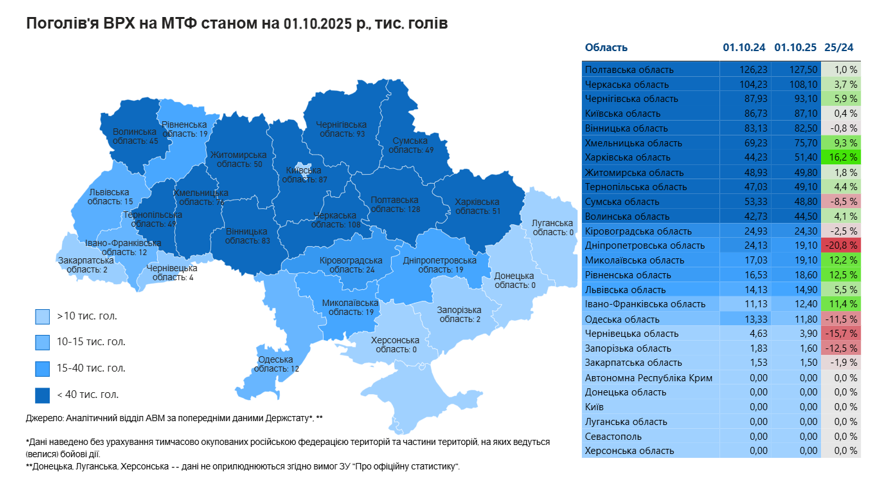 За попередніми даними Держстату, станом на 1 жовтня 2025 року в присадибному і промисловому секторі України утримується 2 млн. 83,7 тис. голів ВРХ, у тому числі 1 млн. 121,7 тис. корів. Порівняно до 1 вересня 2025 року, поголів’я ВРХ в Україні скоротилося на 40,6 тис. голів (-1,9%), а чисельність корів скоротилася на 9,3 тис. голів (-0,8%). Порівняно до 1 жовтня 2024 року поголів’я ВРХ скоротилося на 211 тис. голів (-9%), у тому числі корів – на 121 тис. голів (-10%). Близько 45% тварин утримується на промислових підприємствах, а 55% – в господарствах населення.