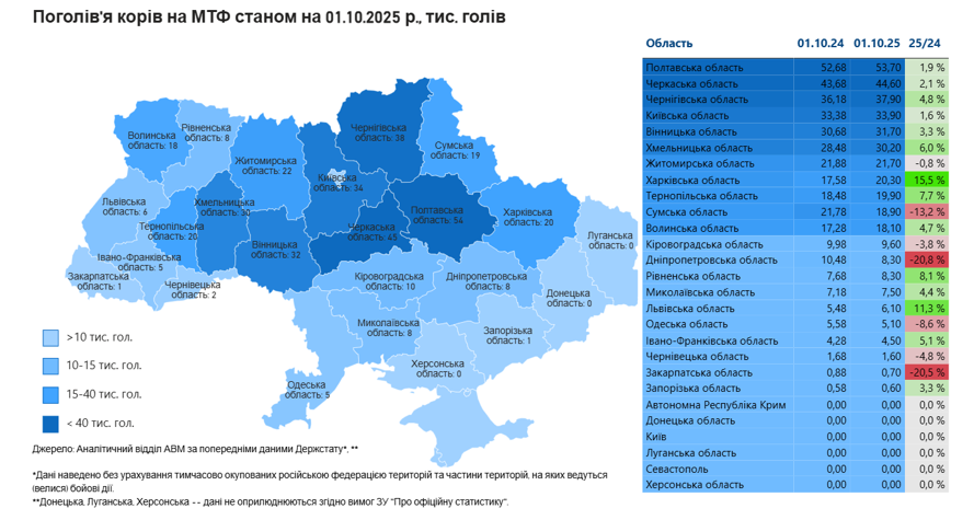 За попередніми даними Держстату, зростання чисельності поголів'я корів зафіксовано на сільськогосподарських підприємствах в Харківській області (+16%), Рівненській області (+13%), Миколаївській області (+12%), Івано-Франківській області (+11%), Хмельницькій області (+9%), Чернігівській області (+6%), Львівській області (+5%), Тернопільській області (+4%), Волинській області (+4%), Черкаській області (+4%), Житомирській області (+2%), Полтавській області (+1%). порівняно до 1 жовтня минулого року.